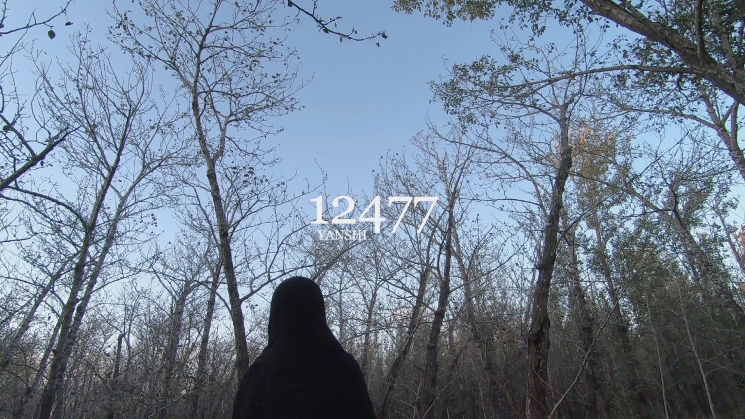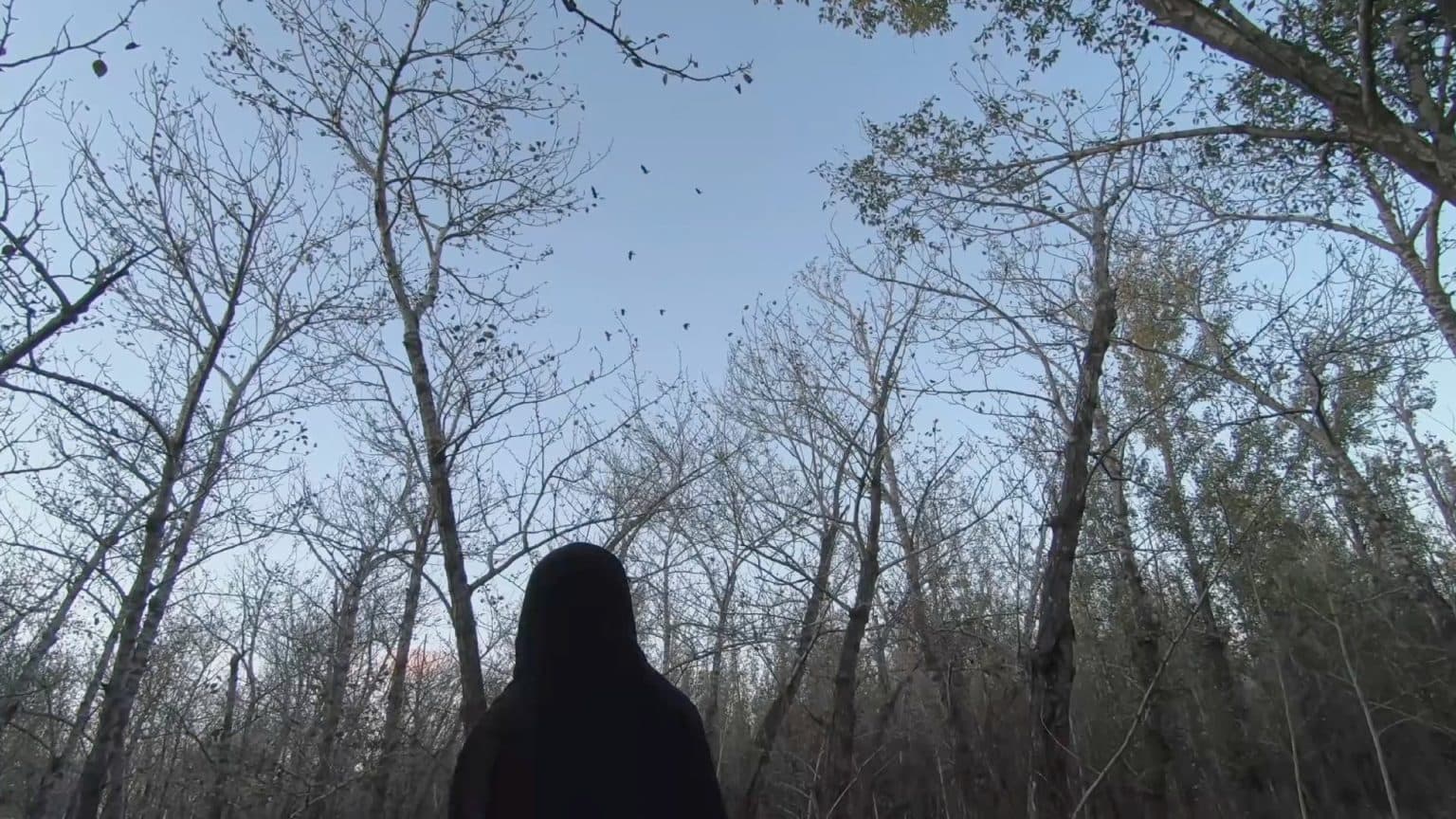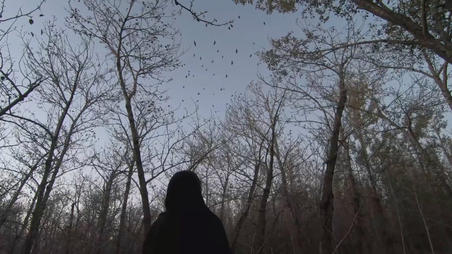 The protagonist in the video, with her back to the camera, was looking at the flock of birds that keeped gathering up above the trees.