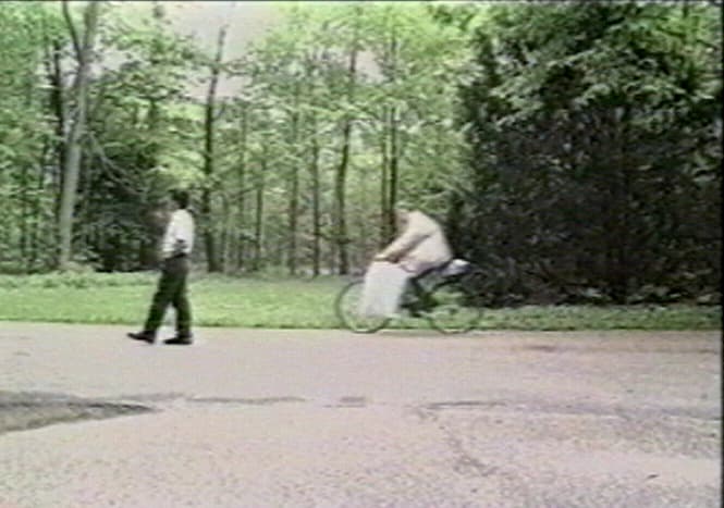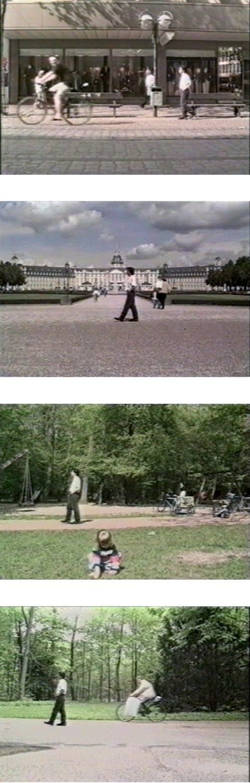 我以非常緩慢的速度往後倒著走,經過森林、市區、觀光景點,這些地點為我1994-97在德國卡斯盧爾Karlsruhe求學生活的地方,影片剪接時,倒轉整個影片並加快速度至我行走的速度為正常往前走的速度,此時周遭的風景、人事物及時間則以加倍的時間倒退著進行。