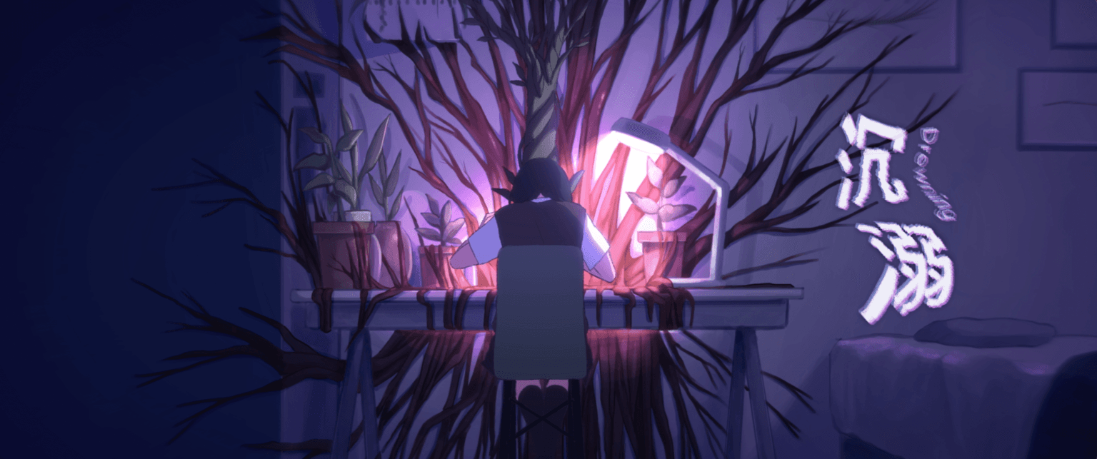 當無知、孤獨、混亂和渴望充斥腦海時,活著又是什麼感覺?在一個病態的社會中,會出現一個病態的人。這個人可能就是你和我。在故事中,孤獨的女孩與植物之間的互動、奇怪的妄想和難以理解的欲望探索了生存的感覺。詞語「沉溺」意味著女孩在她的生活中感覺不到任何東⻄,她沉溺於她的妄想之中。我使用二維動畫來展現小女孩的內心世界,並描述她神秘的妄想之旅。