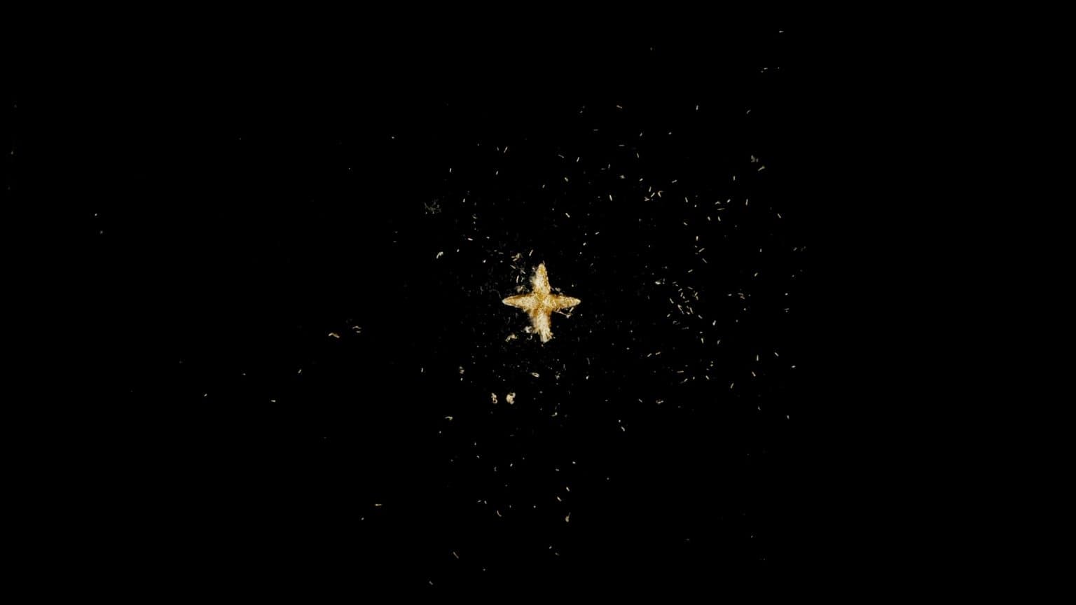 藝術家把一片片現成的星形徽章逐顆拆開,將過程逐格記錄後濃縮成定格動畫,彷彿構建出一座星星爆裂而成的噴泉,盡情展現願望被釋放的瞬間。充滿童真的糖果色星形徽章和近乎暴力的拆解動作構成視覺和情感上的落差,引人屏息靜賞。作品中對星塵、宇宙等浩渺存在的指涉,更如輕聲在耳邊提醒我們,無論大至星球或小至碎布,也許生命最本質的狀態就是轉瞬即逝的無常。脆弱和變幻是我們共享的永恆。