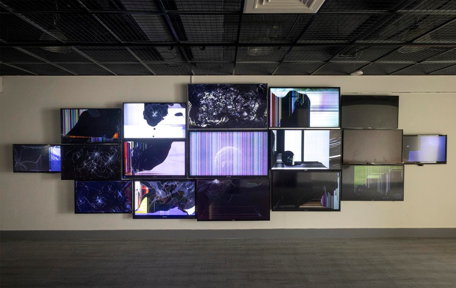 The broken and fragmented flatscreens that hung on the walls were all gathered locally from different second hand markets via social media. Each screen plays a compilation of videos where go pro or dashboard cameras go through spinning movements during accidents. Some videos were found on YouTube, while others were filmed by myself by making the camera go through the circular motions while recording.
